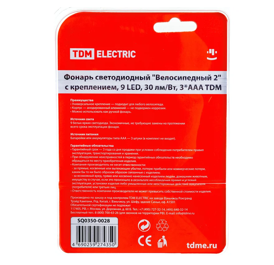Фонарь светодиодный "Велосипедный 2" с креплением, 9 LED, 30 лм/Вт, 3*AAA TDM