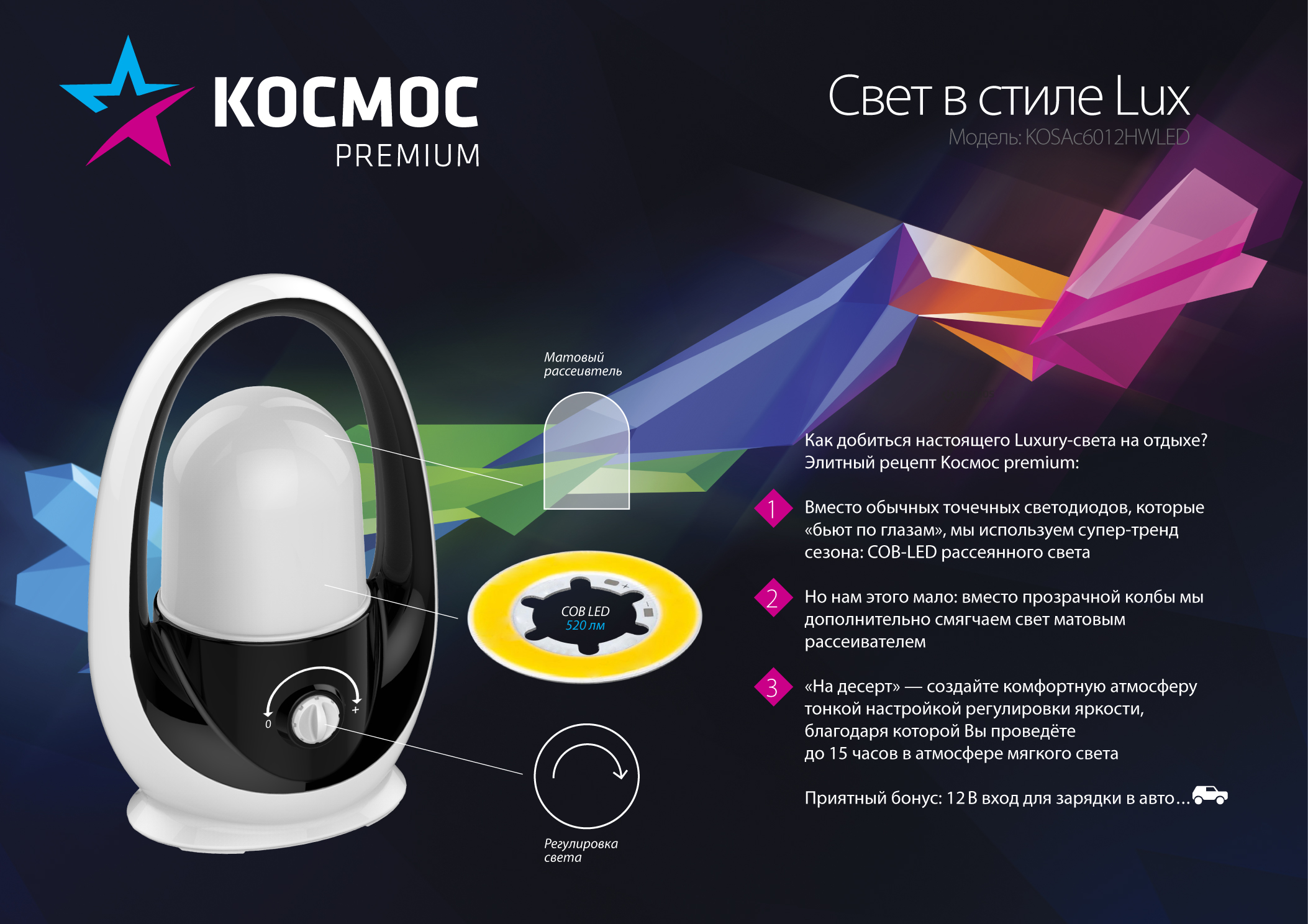 Кемпинговый фонарь-лампа с возможностью регулировки яркости света. Благодаря матовому рассеивателю под которым установлен COB-диод в виде кольца, этот мощный фонарь обладает самым мягким и комфортным светом. Площадь освещения - 60 кв.м, время беспрерывной работы – 4-15 ч. Надежный свинцово-кислотный аккумулятор 4В 2000 мАч, подзарядка от сети.