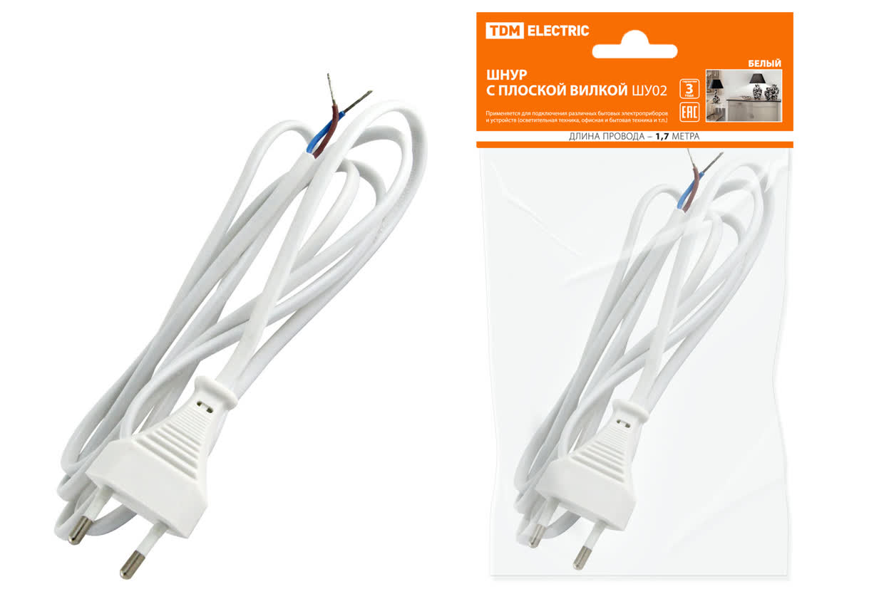 Шнур с плоской вилкой ШУ02 ШВВП 2х0,75мм2 1,7 м. белый TDM