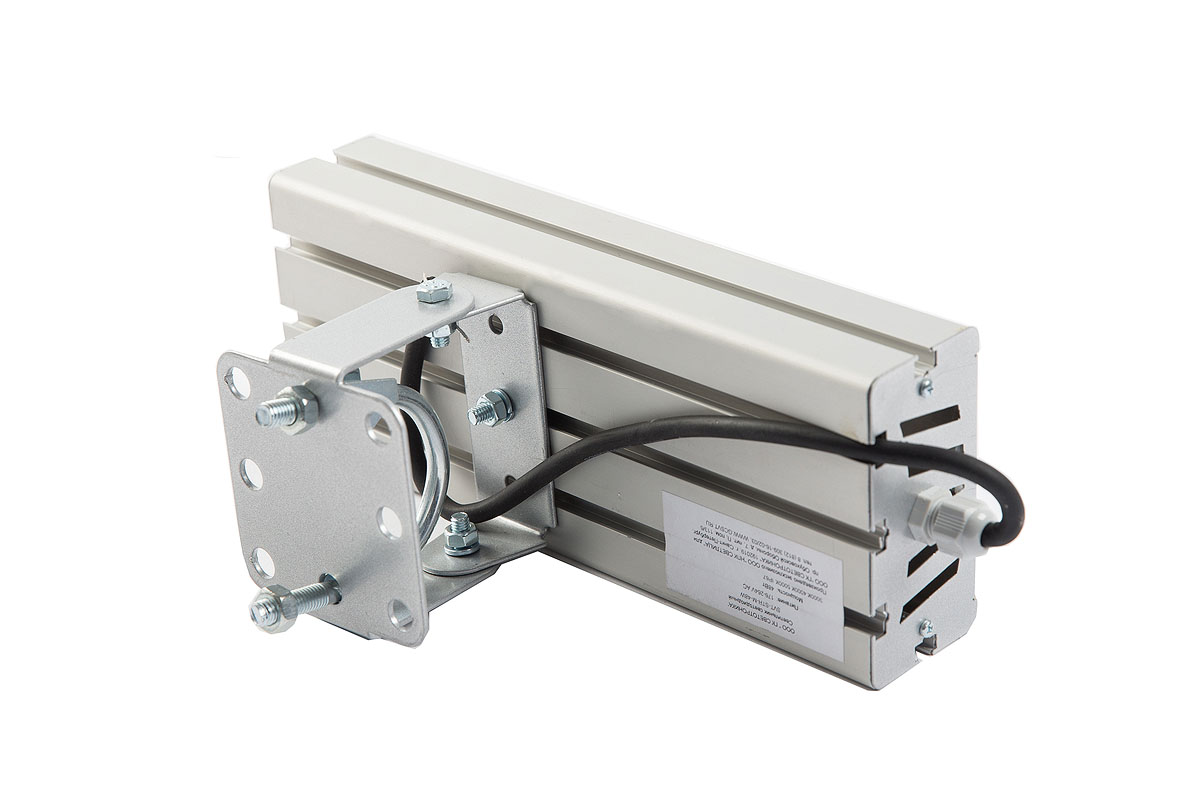 Светодиодный светильник для освещения промышленных объектов, прилегающих территорий и дорог местного значения. Может быть установлен на ровную поверхность с помощью поворотного кронштейна или на трубу диаметром до 50мм, с помощью входящего в комплект хомута. Имеет высокую световую отдачу.